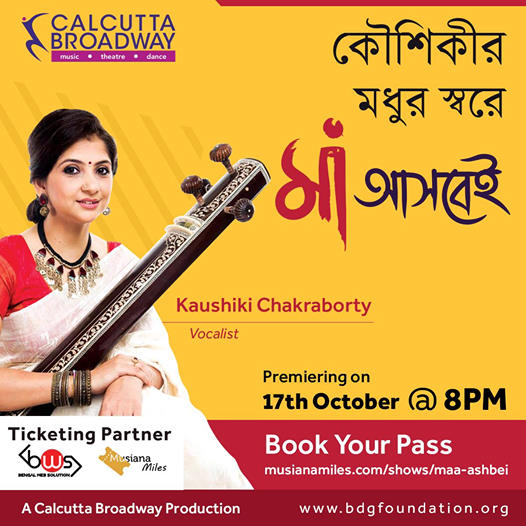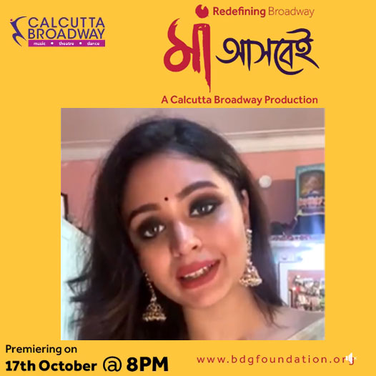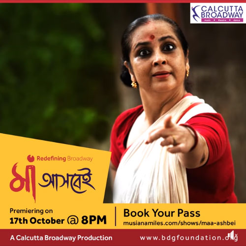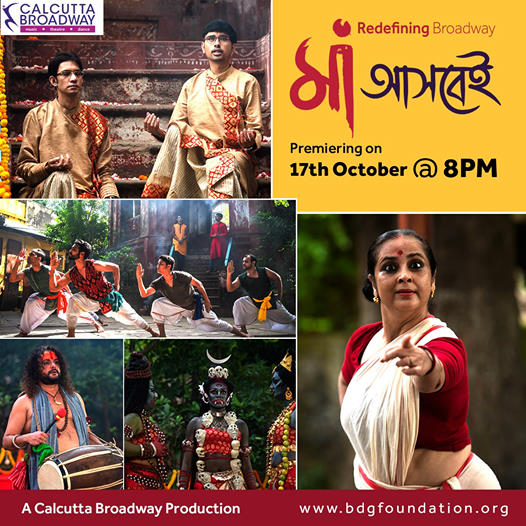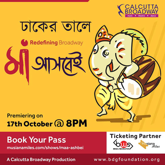 • Let Maa Durga enter your sanctum with unique Broadway show Maa Ashbei! Brought to you by Calcutta Broadway in Aid of performing artistes and backstage technicians, join us in this powerful endeavor of BDG Foundation and Calcutta Broadway to give back to the society. Buy tickets online as Maa Ashbei brings in a whiff of Positive Thoughts to tide over trying times. Tune in on 17th October, 8pm.