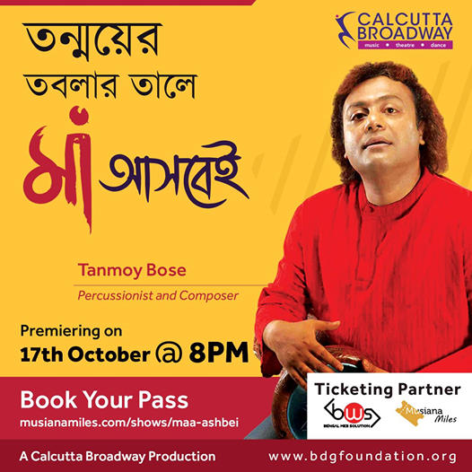 • Well known percussionist and composer Tanmoy Bose will mesmerize you on Calcutta Broadway's unique show Maa Ashbei. Catch up with him, buy tickets of the online Charity show Maa Ashbei and support needy artistes